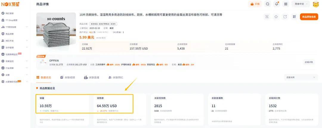 根据Nox聚星的数据显示,过去一个月,这款洗碗抹布销量10.59万,销售额高达64.59万USD(折合人民币约467.63万)!