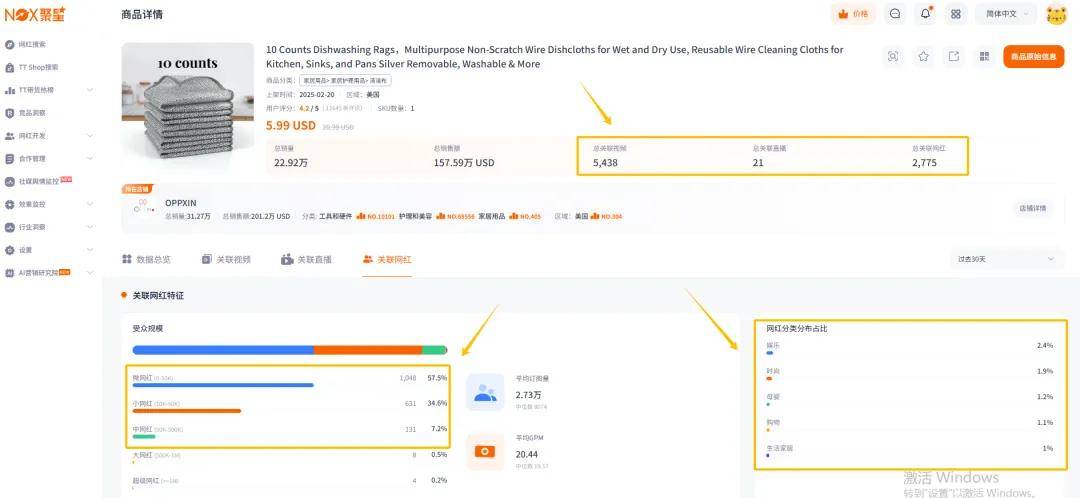 此外,根据Nox聚星的数据显示,自上架以来,三个月不到,这款产品的关联网红已多达2775名,关联带货视频则有5438条,平均每月与1k+网红合作。