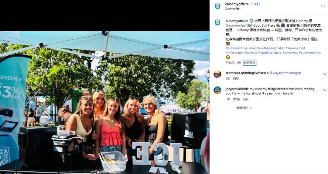 除此之外,EUHOMY还会参与 Summerfest 这样具有广泛影响力的大型音乐节活动,在活动现场设置展位,放置品牌制冰机产品,提供免费冰水,并展示产品优惠信息(如图片中 “53% OFF” )。