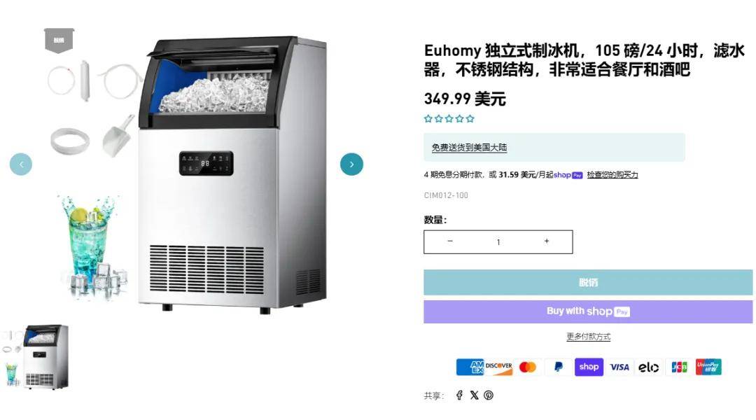 还有商用高效款制冰机——24 小时制冰量达 105 磅,适用于咖啡馆、酒吧,产品上线半年即进入沃尔玛商用设备采购清单;