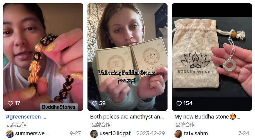 从其合作网红视频来看,视频封面均直观展示产品细节(手链、项链的材质、设计),并突出品牌专属包装(印有 “Buddha Stones” 莲花 logo 的布袋、品牌礼盒),让用户一眼识别产品样式+品牌标识,强化视觉记忆点。