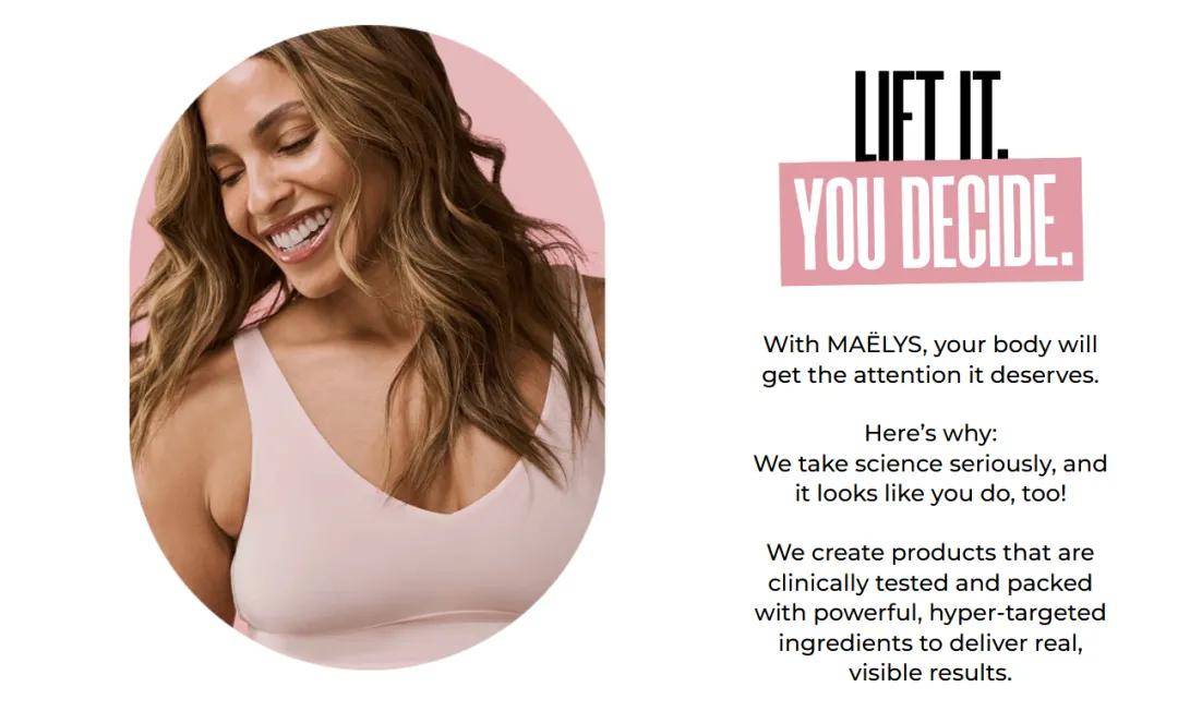 有了渠道,还要有复购。MAËLYS把身体自信写进品牌DNA:包装外盒印着”Love every curve”,官网首页不是完美模特,而是不同肤色、不同身材的素人照片;会员积分不叫points,而被命名为confidence credits。情感共鸣换来惊人的黏性,其独立站复购率达42%,远高于护肤行业平均的28%。