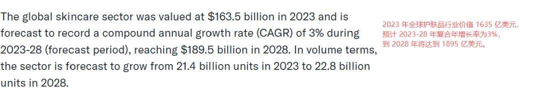 根据GlobeNewswire报告,2023 年全球护肤品行业价值 1635 亿美元,预计 2023-28 年复合年增长率为3%,到 2028 年将达到 1895 亿美元。