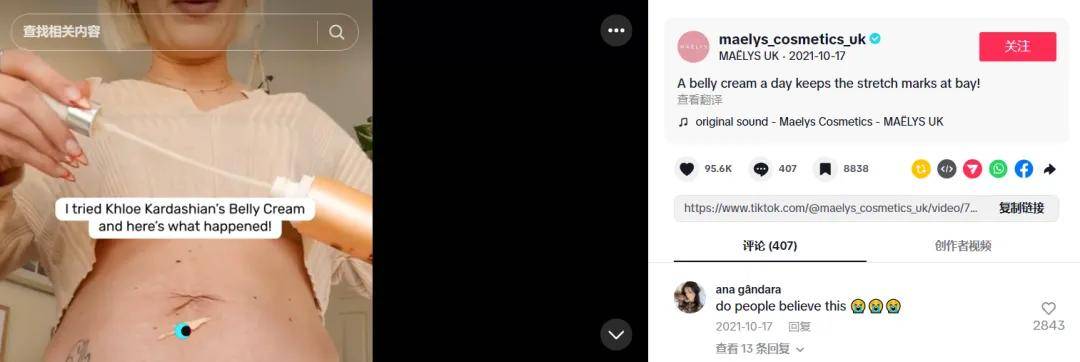 品牌账号持续输出“护理前后对比”、“产后修复日记”等原生内容,例如TikTok上 “使用产品后的妊辰纹变化” 的短视频获得近10万点赞,评论区充斥着求购买链接的互动诉求。
