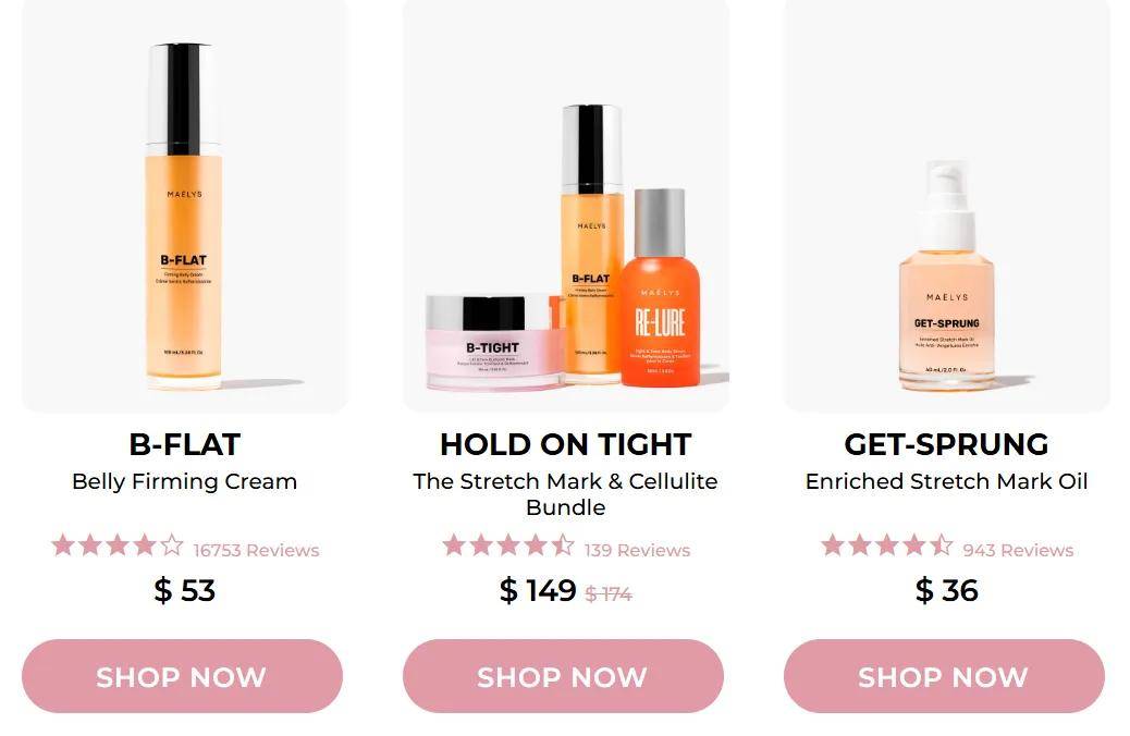 创始人Sharon Rahim正是踩中了这一风口,其在孕后发现,市面上几乎没有为身体局部松弛、妊娠纹和橘皮定制的高效产品,而产后与健身人群对此需求迫切。于是她带领团队用临床级活性成分包裹进柔滑的乳霜与膜布,把面部护肤的严谨配方逻辑搬到胸、腹、臀、大腿,顺势定价35-200美元,介于药妆与奢侈护理之间的空白带。
