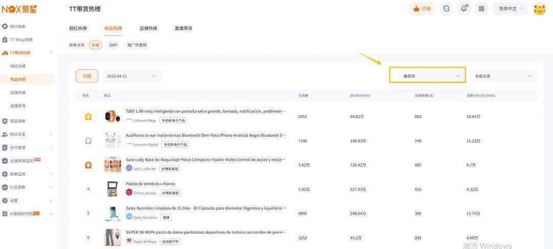 用Nox聚星1分钟不到即可调取墨西哥站各品类TOP1000热销品,直接对标竞品定价策略!