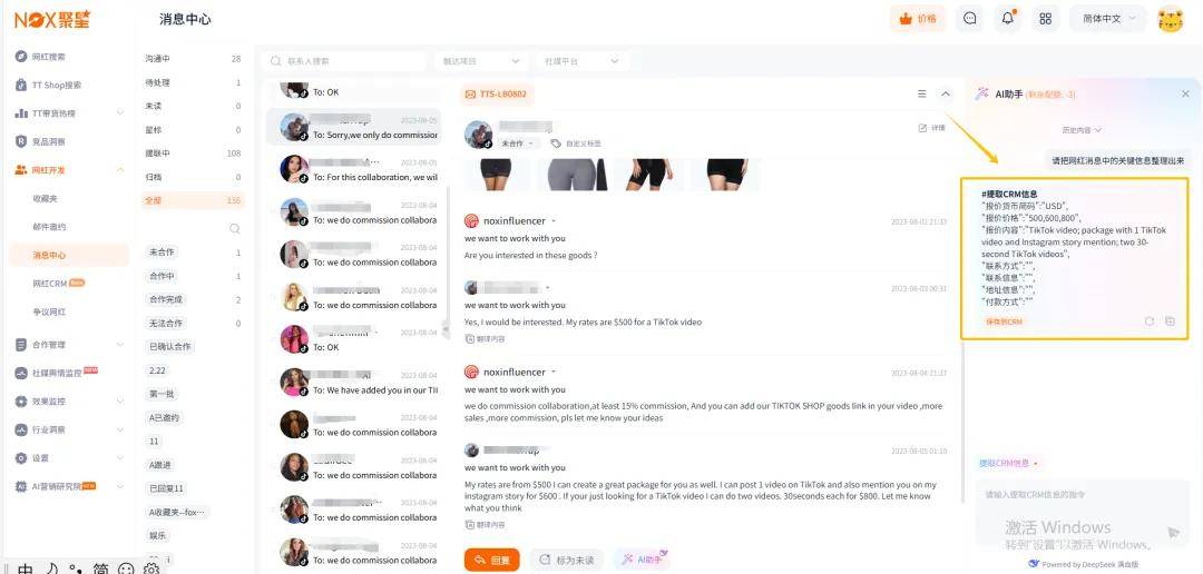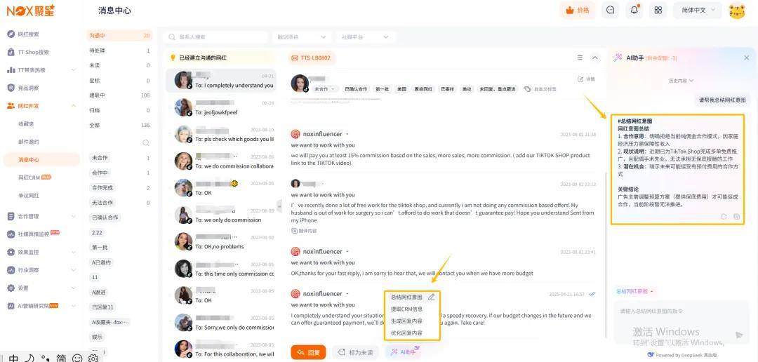 Nox聚星的这个功能,可以直接根据网红邮件内容,快速生成一个专业的、高转化率的回复话术,帮你节省大量的时间和精力。