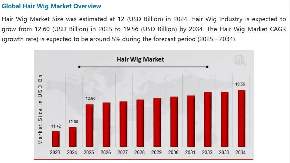 Market Research Future调查显示,2024 年,全球假发市场规模预计为120亿美元。假发行业预计将从 2025 年的126亿美元增长到 2034 年的195.6亿美元。在预测期内,假发市场复合年增长率预计将在 5% 左右。
