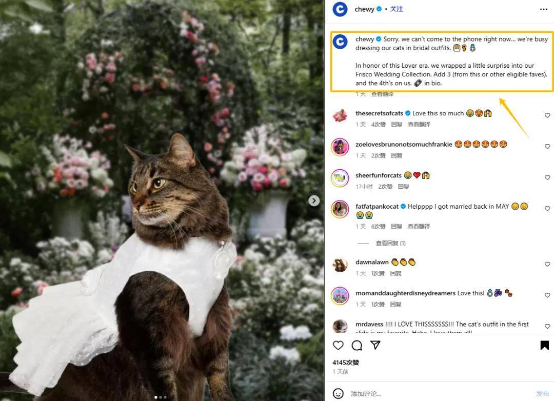 Chewy品牌把“订婚”演绎成“喵婚”,24 小时斩获4k+点赞。