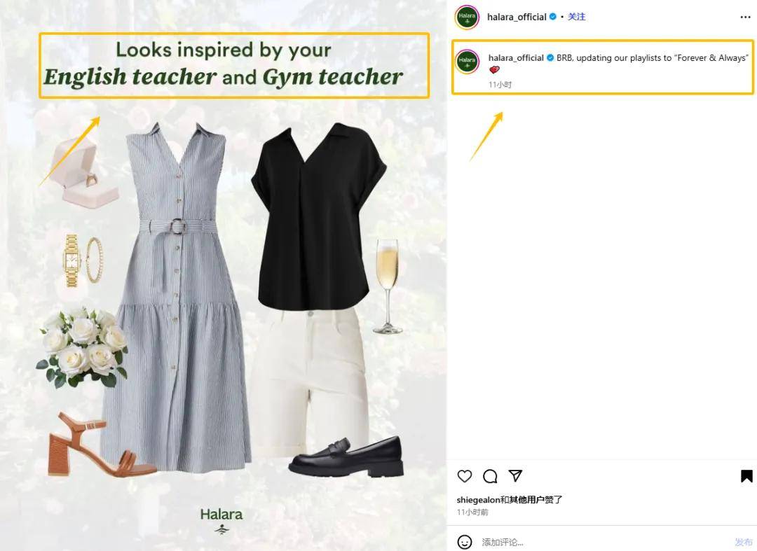 Halara直接推出“English teacher & Gym teacher”同款穿搭Look,把网友热梗(“英语老师 × 体育老师”)直接写进文案,蹭上热搜首波峰值。