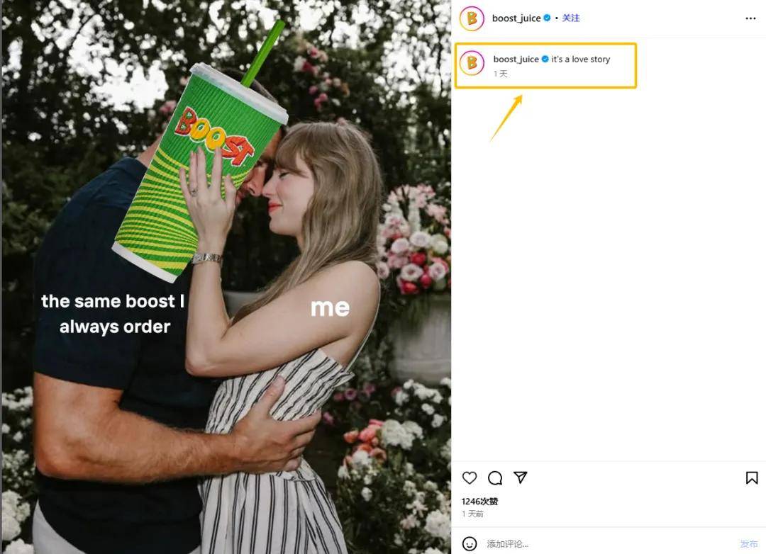 boost juice品牌发布的文案 “it’s a love story” 直接引用霉霉经典歌曲《Love Story》的歌名。