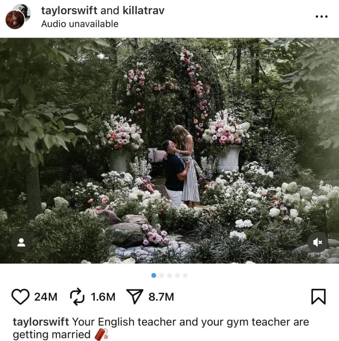 前天,泰勒·斯威夫特(Taylor Swift)在 Instagram 发布与 NFL 橄榄球星特拉维斯·凯尔斯(Travis Kelce)的订婚合照。不到 24 小时,这张合照以多项破纪录的数据,让全球社媒进入“泰勒时间”。