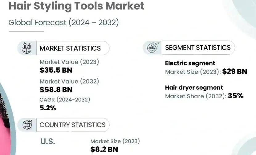 根据Global Market Insight报告显示,2023年全球发型工具市场估值达355亿美元;以5.2%的年复合增长率测算,该市场规模预计将从2024年的 372 亿美元稳步增长,至2032年突破588亿美元。