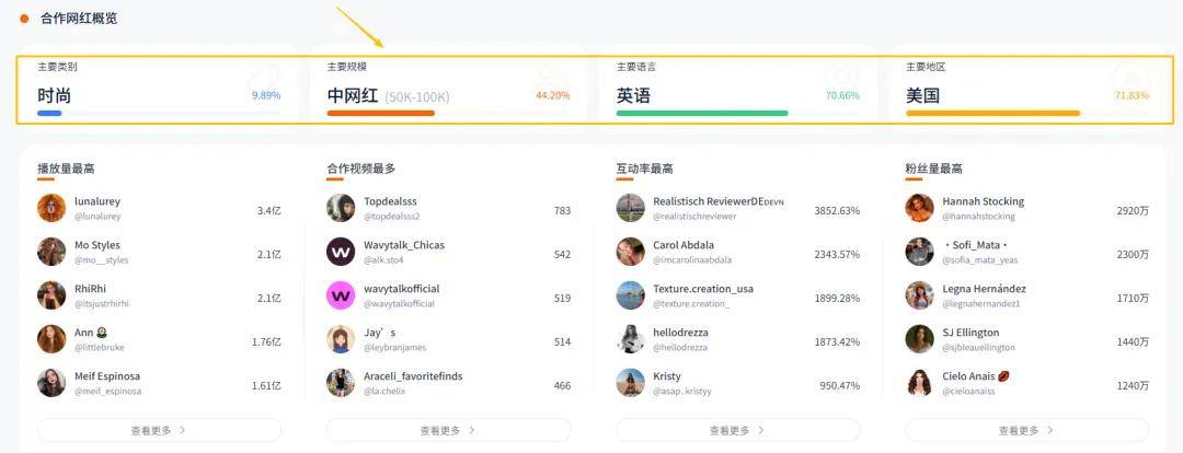 其主力合作中型网红(50K-100K 粉丝),这类网红占比高达 44.20%,既具备一定的内容创作能力和粉丝粘性,又比头部大 V 成本更低,适合高频、批量合作(如合作视频最多的 Topdealss、Wavytalk_Chicas 等均是中网红)。