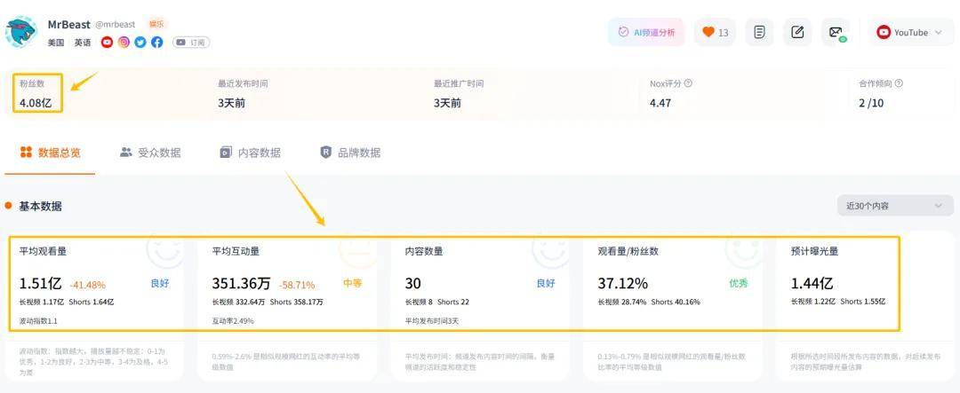 根据Nox聚星平台最新数据显示,Mr Beast的全球粉丝体量已突破5亿(仅YouTube主频道就超4亿),覆盖范围之广、粉丝粘性之强,堪称现象级。
