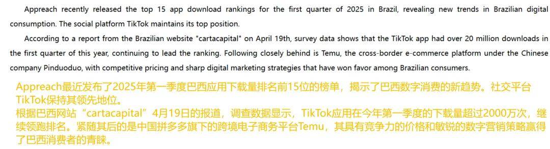 近日,在应用程序广告机构Appreach发布的2025年第一季度巴西应用程序下载量 TOP15榜单中,TikTok以超过2000万次的下载量成功登顶。
