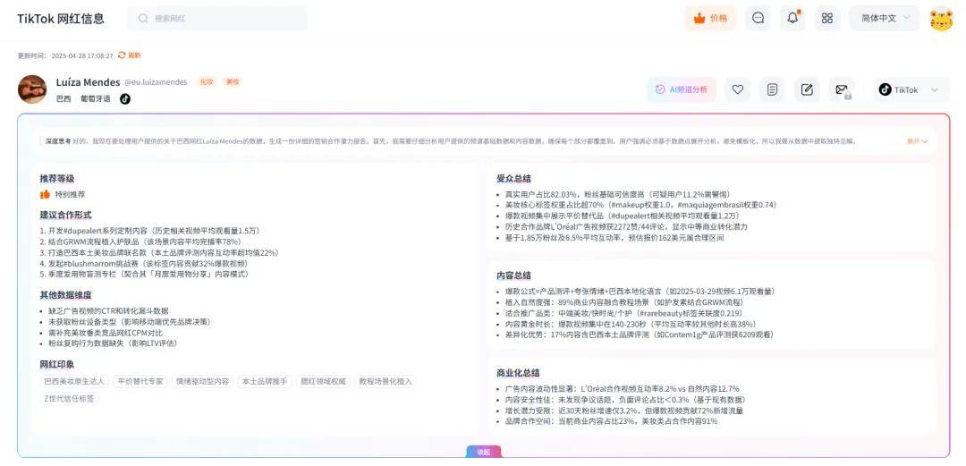 不仅如此,还能自动生成一份网红营销潜力报告,帮您快速甄别与总结巴西网红的信息!