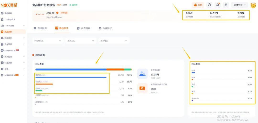 根据Nox聚星平台的数据显示,其主要以TikTok为阵地,多与与时尚、娱乐、电子产品类小微网红合作。其TikTok关联网红多达3.91万名,总曝光量高达6.91亿!