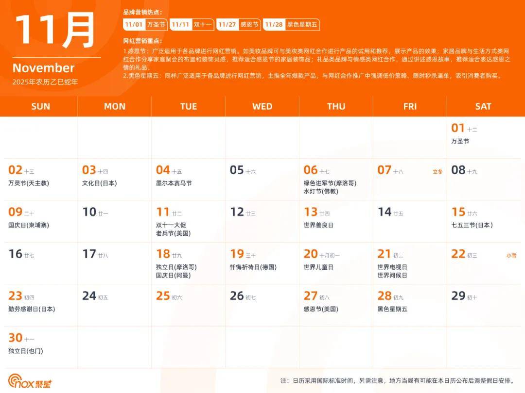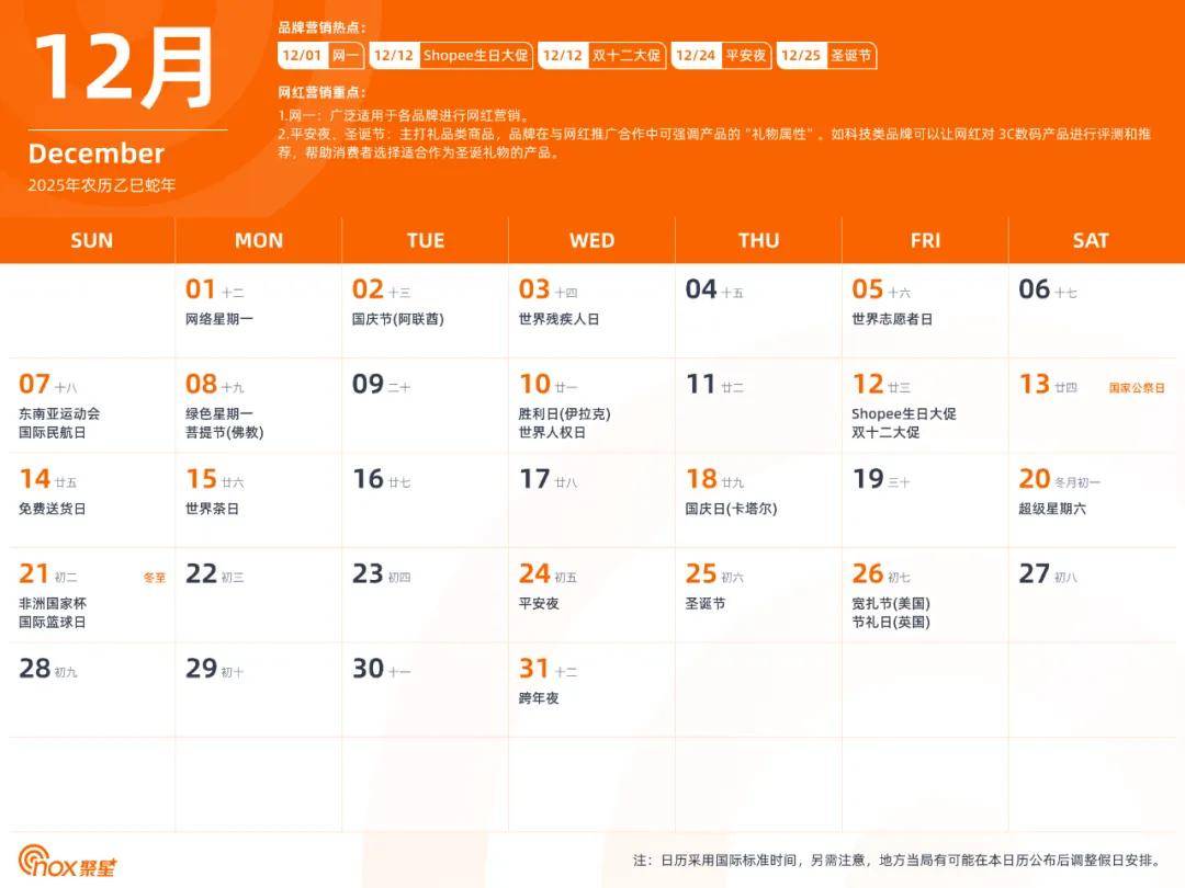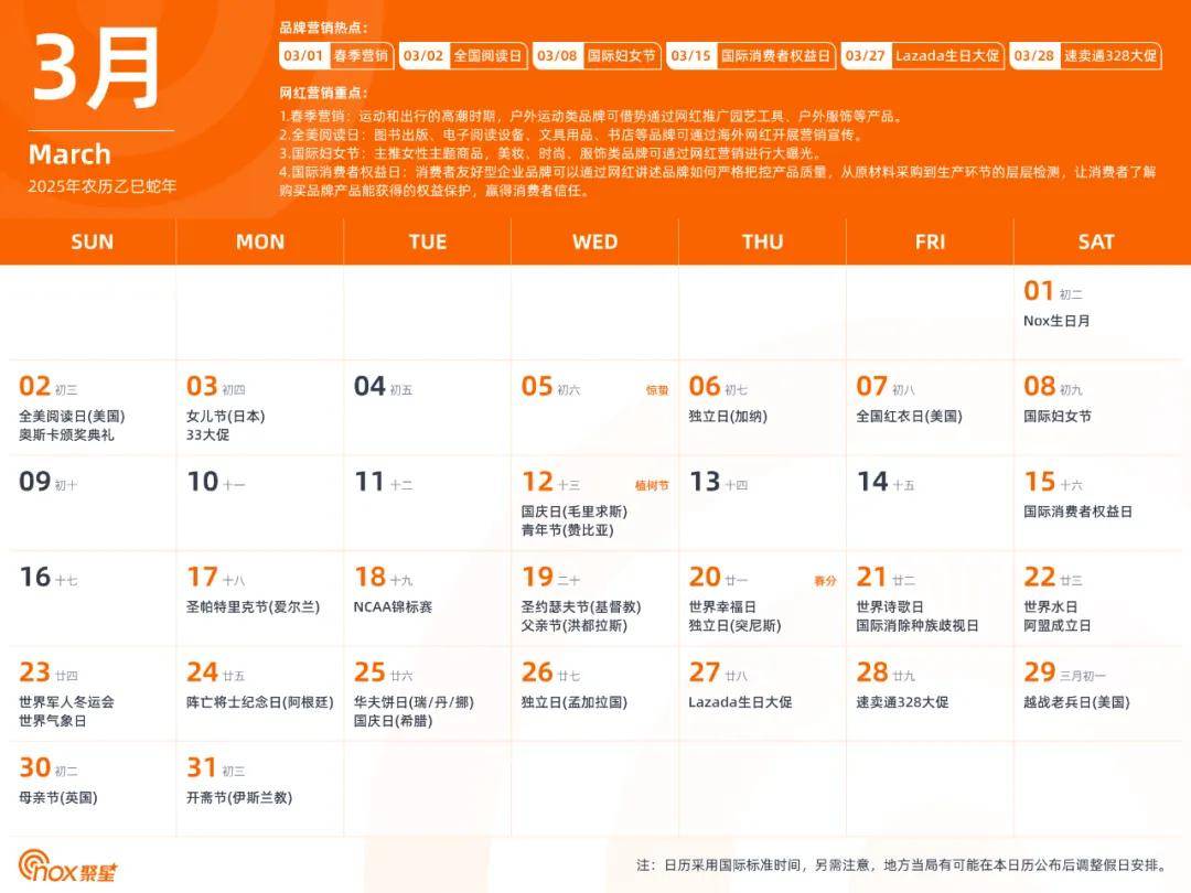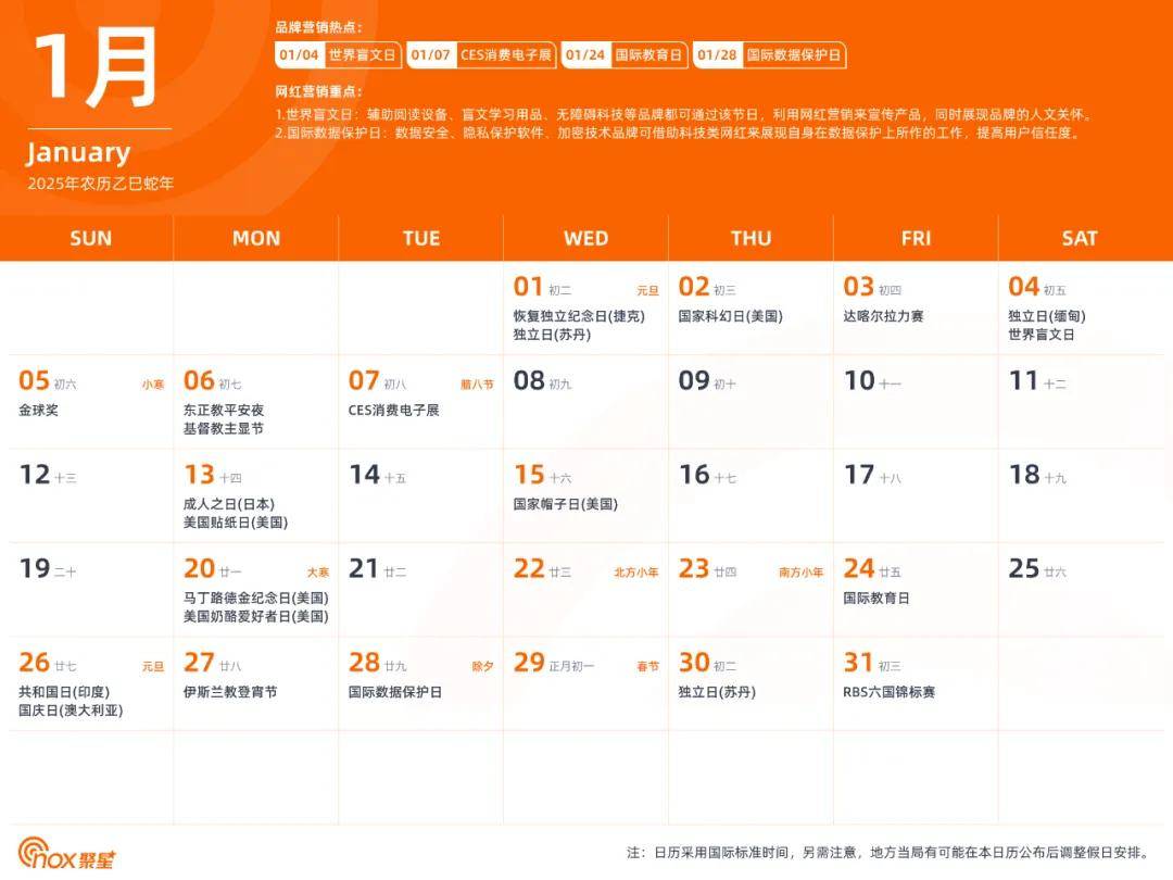 现在,Nox聚星精心制作了一份全网独一无二的2025年海外网红营销日历,除了海外基本节日外,还涵盖了各个不容错过的品牌营销热点和网红营销重点,有了它,你们就能轻松拿捏海外网红营销,不错过每一个营销节点。