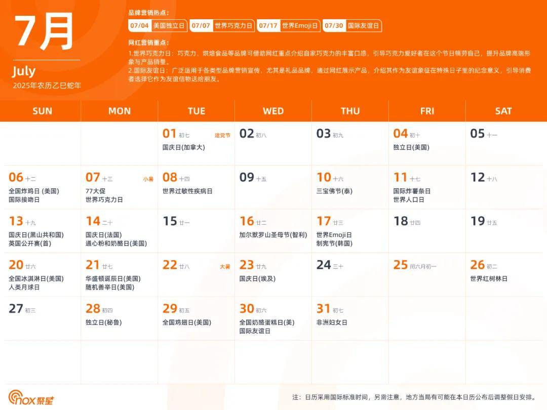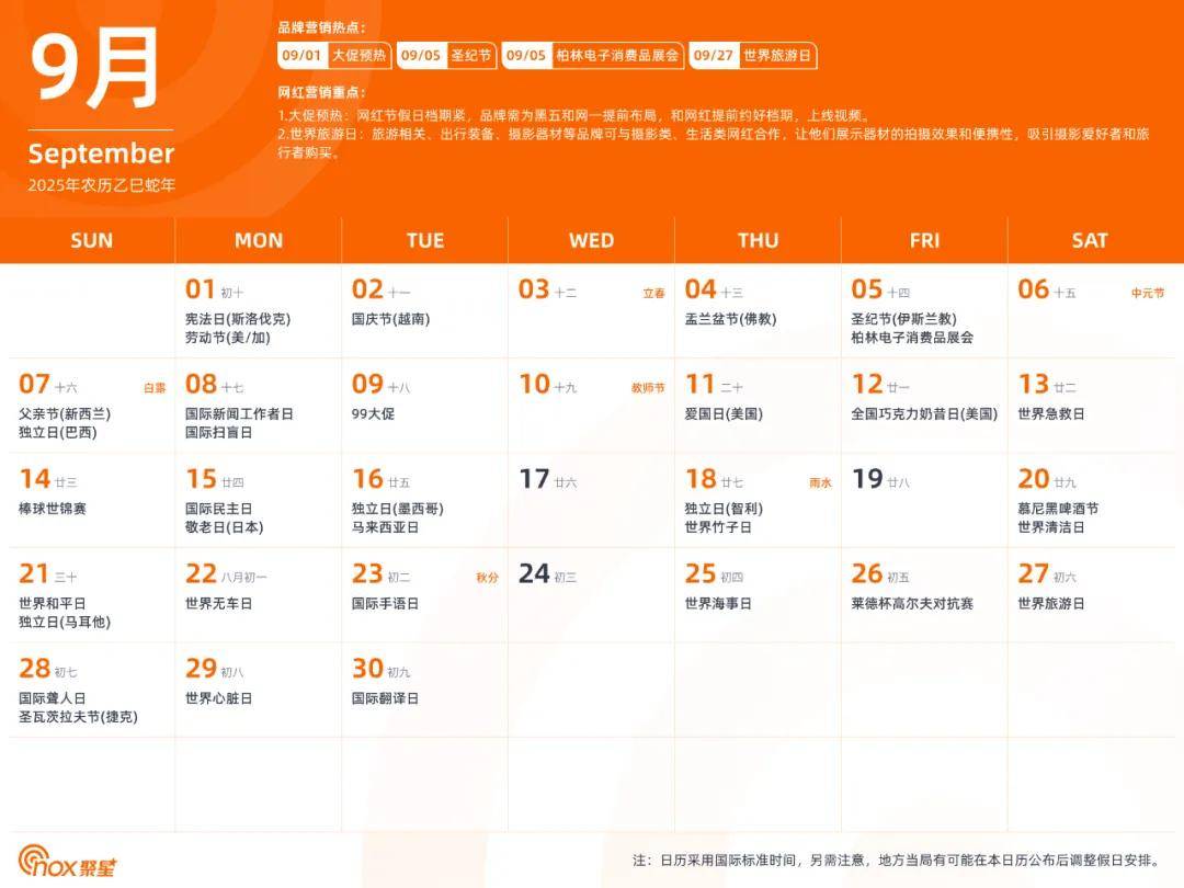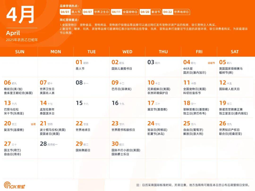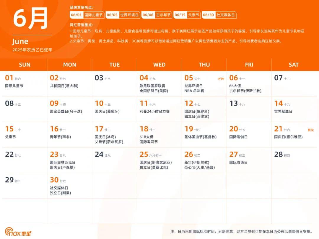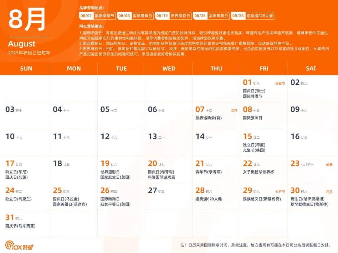现在,Nox聚星精心制作了一份全网独一无二的2025年海外网红营销日历,除了海外基本节日外,还涵盖了各个不容错过的品牌营销热点和网红营销重点,有了它,你们就能轻松拿捏海外网红营销,不错过每一个营销节点。