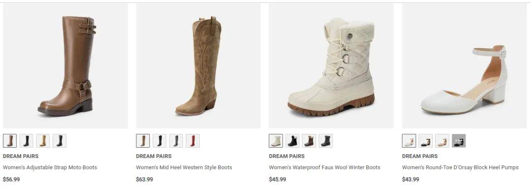 在品类布局上,Dream Pairs 采用 “核心突破 + 矩阵覆盖” 策略。以女鞋为基本盘,延伸出高跟鞋、乐福鞋、运动鞋等全场景产品线,同时通过母公司构建多品牌生态,例如 Bruno Marc 专攻职场男鞋、NORTIV 8 聚焦户外功能鞋、Dream Pairs Kids 深耕童鞋市场,形成 “鞋圈全家桶” 布局,覆盖全人群消费场景。