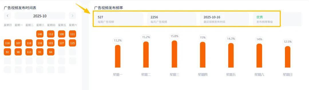值得一提的是,其广告发布频率也十分优秀,平均每周发布528条,每月发布2256+广告。