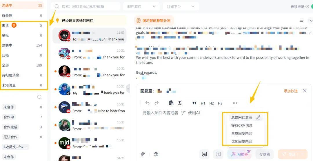 而Nox聚星的网红开发功能可以帮您用AI总结网红的意图、自动生成回复内容,节省时间的同时还能分类管理网红的消息,让您一目了然。