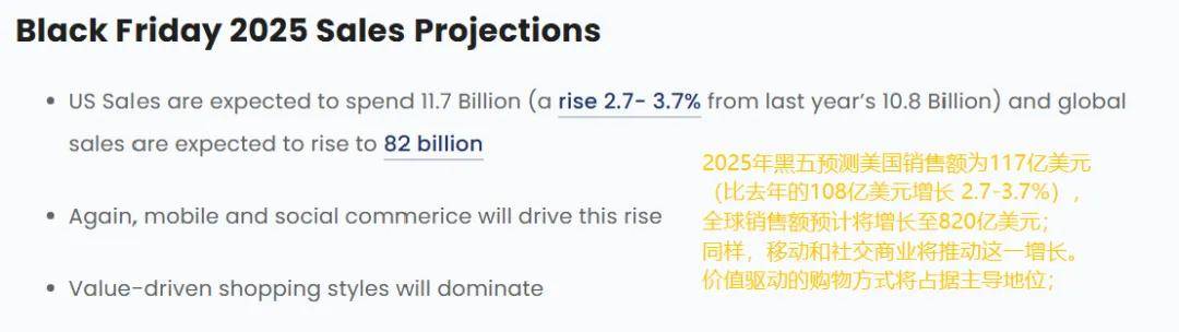根据 Audiense 预测,2025年黑五期间美国销售额预计为117亿美元,全球销售额预计将增长至820亿美元。