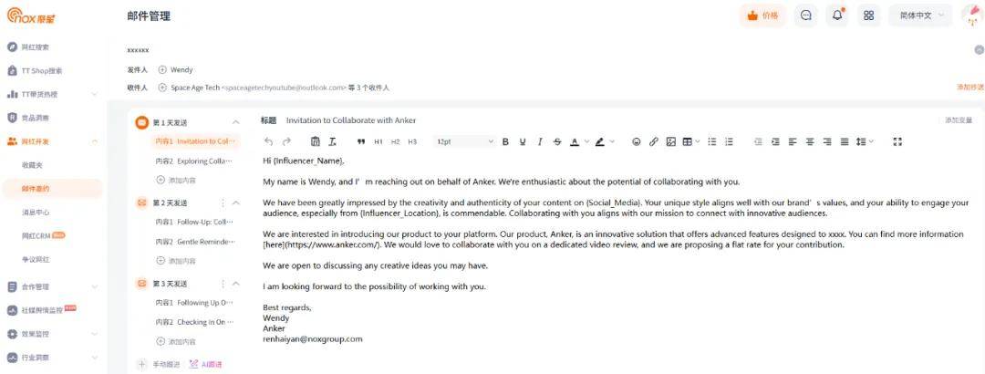 而在 Nox聚星这种能力不仅仅可以运用在网红搜索中,邮件发送、邮件回复等网红邀约环节,也实现了自动化: