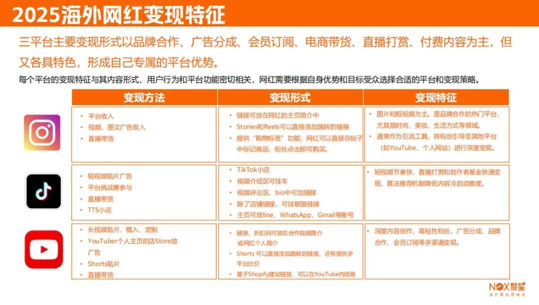 Instagram、TikTok、YouTube均以品牌合作、广告分成、电商带货等为核心变现方式,但各显神通。