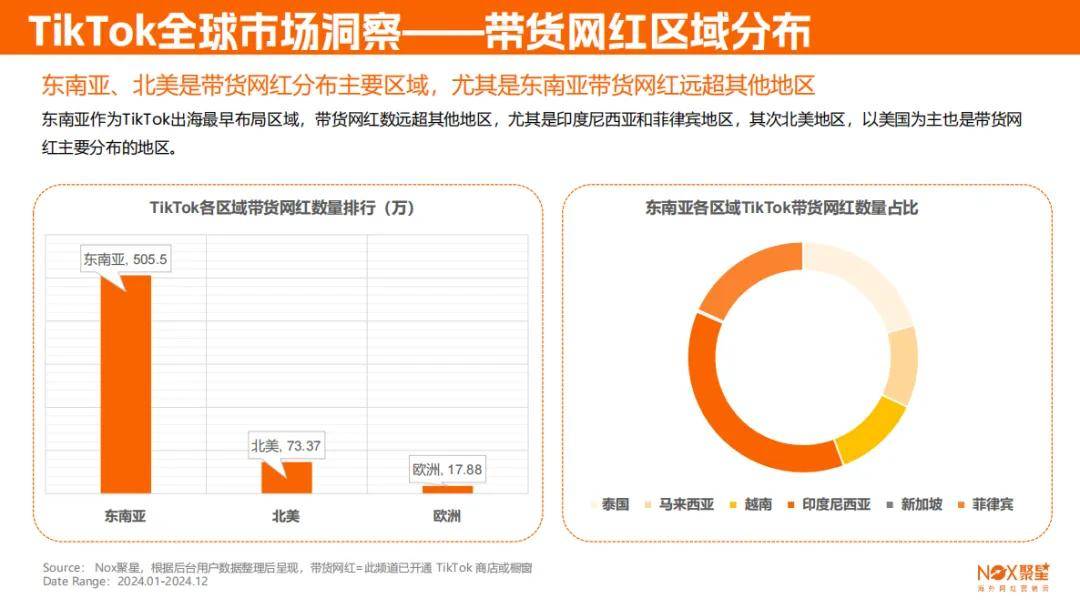 TikTok带货网红的区域分布呈现出明显的差异。东南亚地区以五百万的带货网红数量遥遥领先,北美地区位居第二。