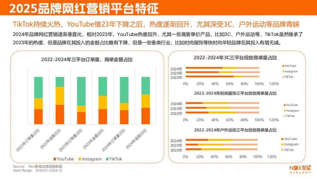 YouTube在2023年热度下滑后强势回升,成为3C、户外运动等高客单价产品的营销优选。