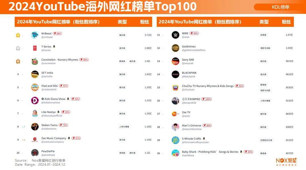 从2024年YouTube海外网红榜单Top100 可见,平台网红生态以娱乐内容为核心主导,大批娱乐类网红如MrBeast(3.71 亿粉丝)强势霸榜,同时音乐、教育、体育、游戏等多元赛道同步开花,覆盖不同受众需求;