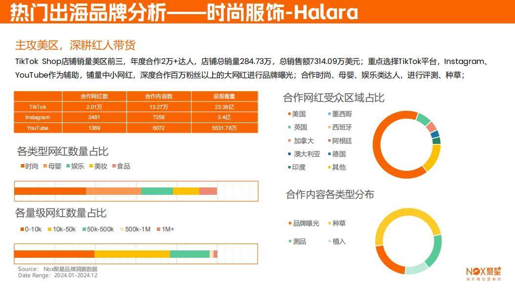 此次,Nox聚星更是带来年度重磅《2024-2025海外网红营销生态报告》。在此次报告中,Nox聚星基于自身1亿+网红真实数据,对全球200+国家和地区网红营销等相关数据进行分析,就全球概况、趋势洞察、品牌投放特征、网红发展特征、重要市场概况、全球榜单六大方面,通过数据对2024年全球海外网红营销生态发展做出细致洞察,帮助品牌更好把握网红营销最新动向。