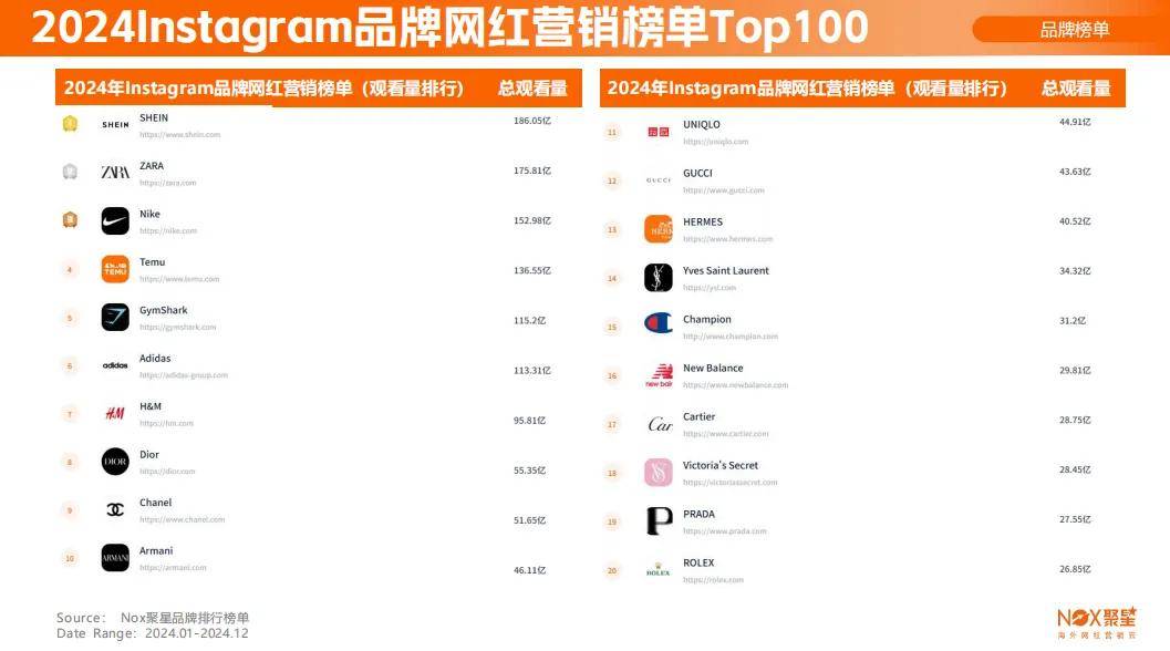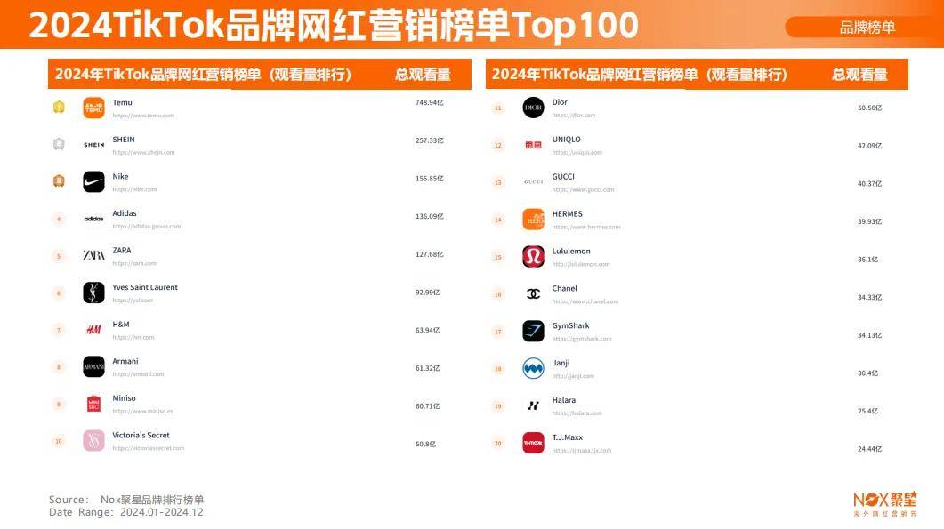 快时尚、运动品牌占据流量高地,Temu以748.94亿总观看量领跑,SHEIN、Nike、Adidas等紧随其后;迪奥、古驰、香奈儿等奢侈品牌亦借网红营销收获高关注。