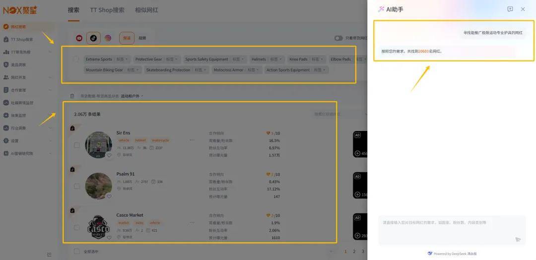 某品牌想推广专为极限运动爱好者设计的专业护具。通过 AI 助手,除了在极限运动领域的网红搜索外,AI还会拓展到户外探险、健康生活方式等领域的网红。