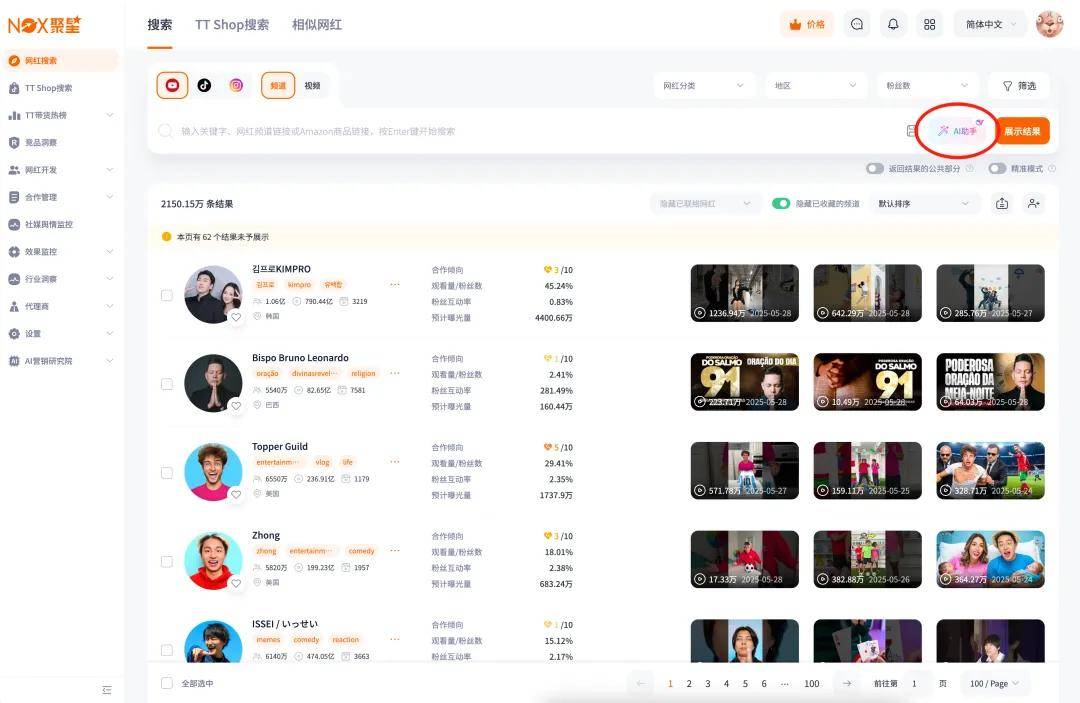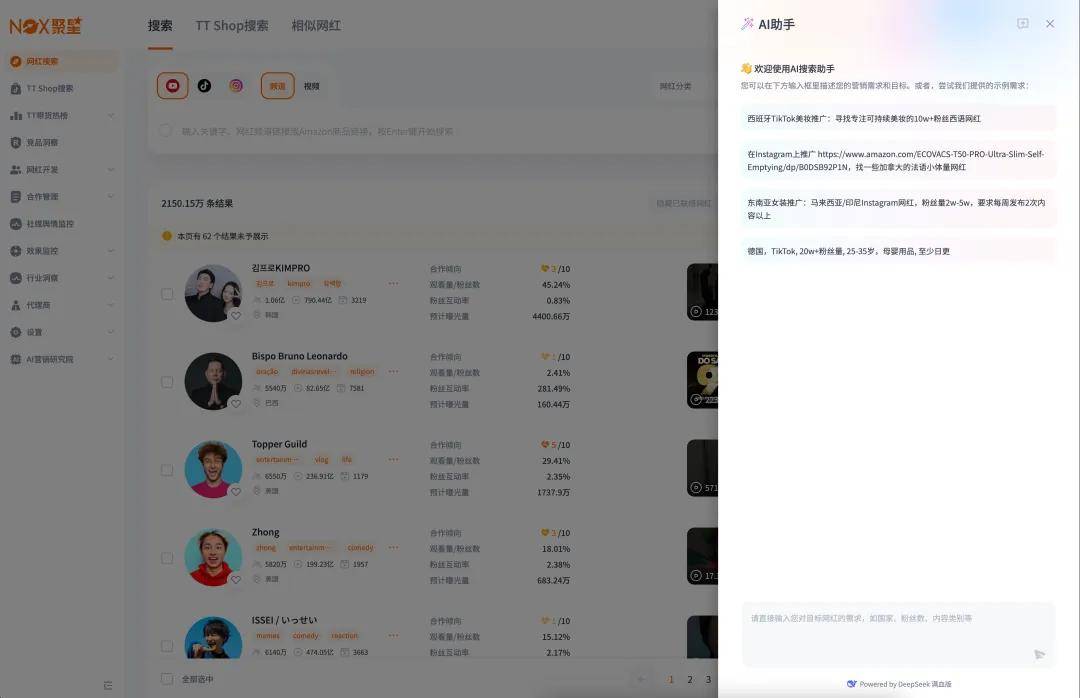 Nox聚星【AI助手】融入搜索主流程!用自然语言开发网红,更快、更准、更高效!(网红营销必看)