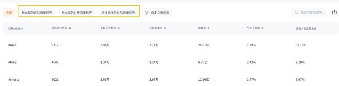 (4)新增内容语言和标签列表,支持按内容语言筛选Hashtag使用情况,区分自然与付费流量标签。