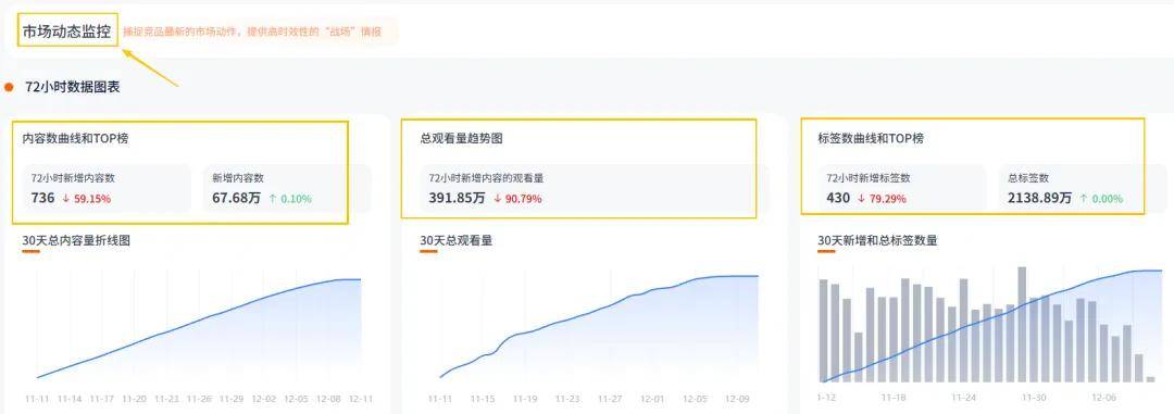 (5)新增市场动态监控,同步监控竞对的内容发布、观看量、标签使用等核心数据,用 “实时波动 + 趋势曲线” 的形式,给品牌提供高时效性的竞品动作情报。