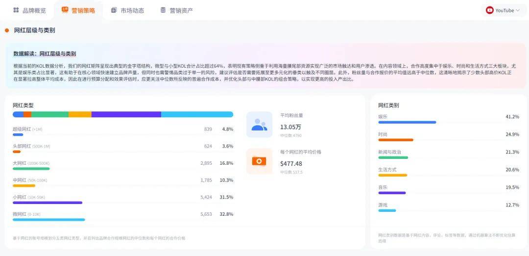 竞对营销策略板块:深度拆解竞对的网红策略(合作层级、CPE 成本)、内容策略(主题词云、Hashtag 标签)、受众策略(区域 / 年龄画像),帮品牌精准识别竞对的优势点(如 “高爆款率内容逻辑”)与缺口(如 “未覆盖的头部网红”);