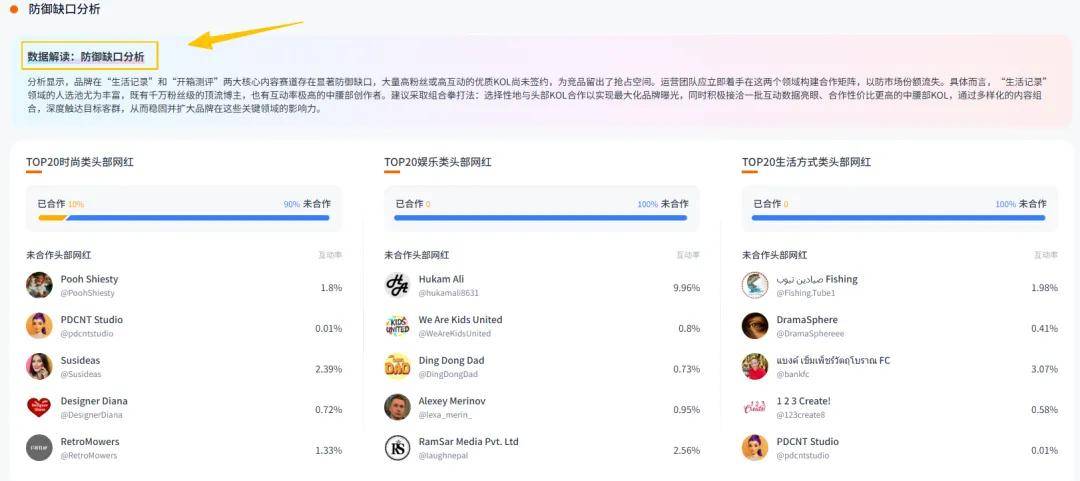 (3)新增防御缺口分析,AI帮助品牌识别各品类中未合作的头部网红以发现竞争机会。