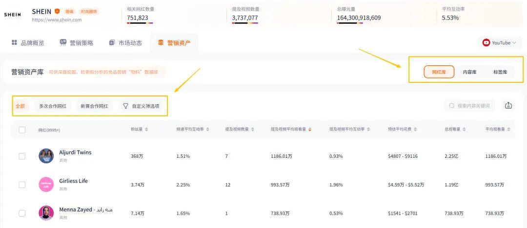 营销资产板块:整合竞对的网红库、内容库与标签库,支持 “多次合作网红”“高互动内容” 等预制筛选,品牌可直接复用竞对沉淀的高价值资源(如 “竞对的优质合作网红清单”),减少试错成本。
