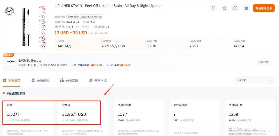 据悉,它是中国香港人Sarah Cheung打造的产品,也是品牌SACHEU Beauty下的爆品,已经在TikTok上产生2689万美金的GMV。近期借势三八妇女节,这款产品的销量再次明显提升。