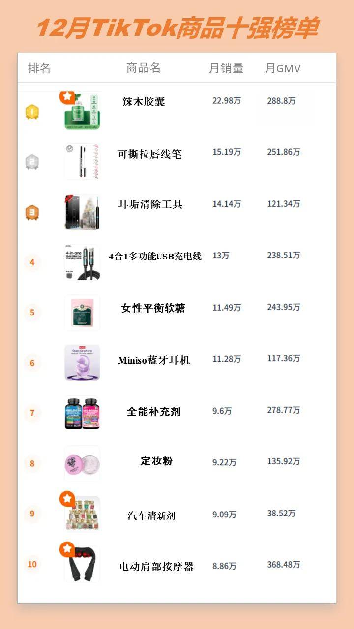 辣木胶囊以 22.98 万的月销量和 288.8 万的月 GMV 位居榜首,成为TikTok12月最畅销和最具商业价值的商品。