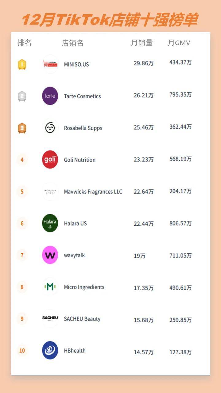 Miniso凭借创新的蓝牙翻译耳机以 29.86 万的月销量和 434.37 万的月 GMV 坚挺在榜一,而Tarte Cosmetics 虽然月销量为 26.21 万,排名第二,但月 GMV 达到 795.35 万,显示出其较高的客单价。