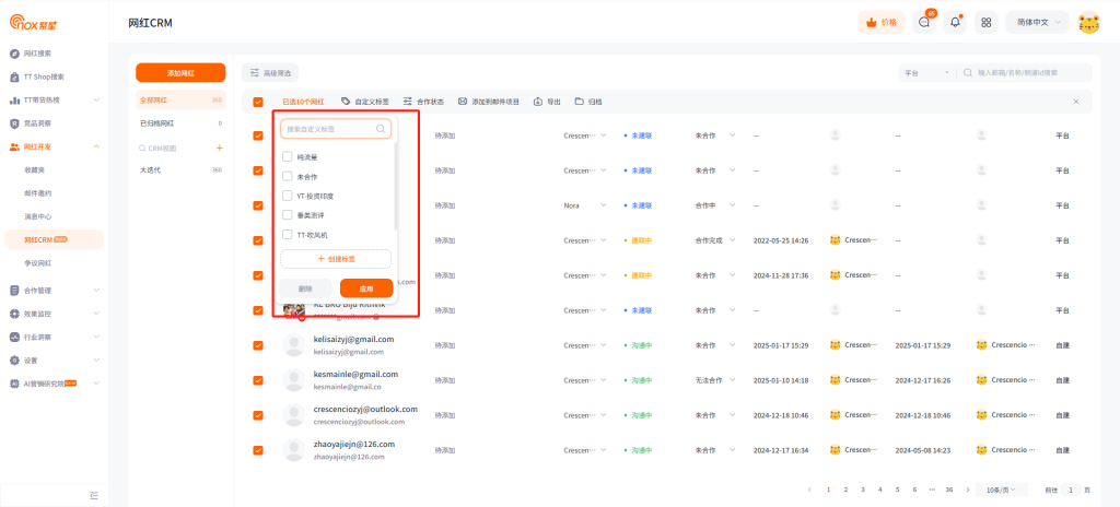 2. 通过消息中心里状态为“沟通中”,即回复了消息的网红,自动添加到CRM。对接人为对应邮件项目的创建者