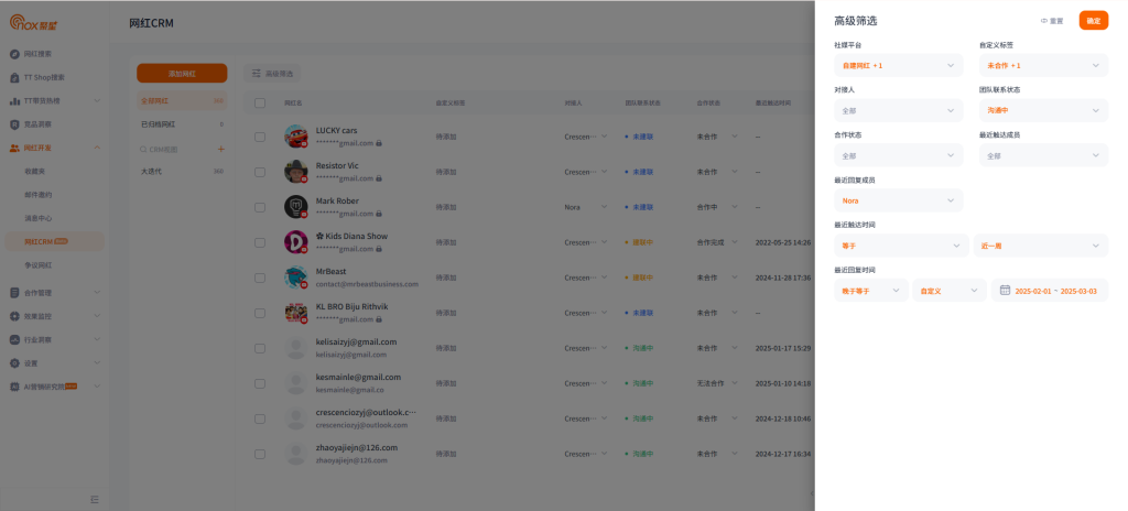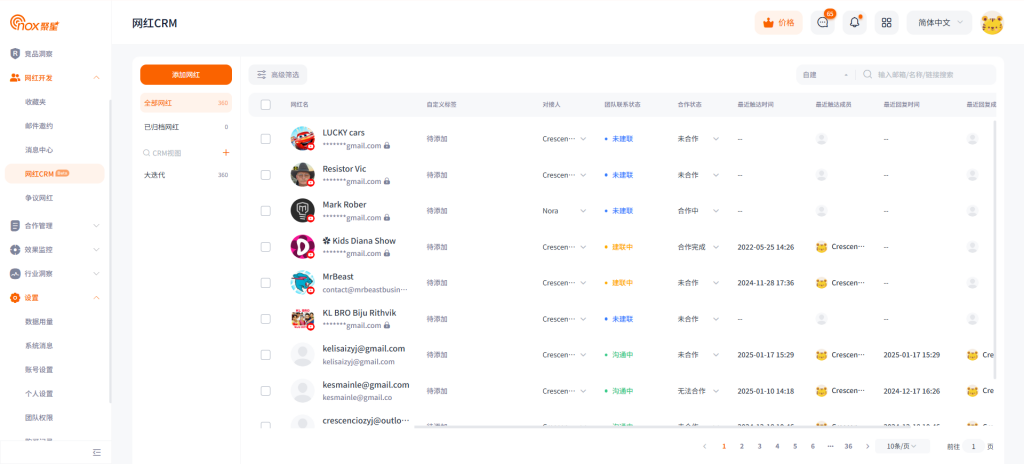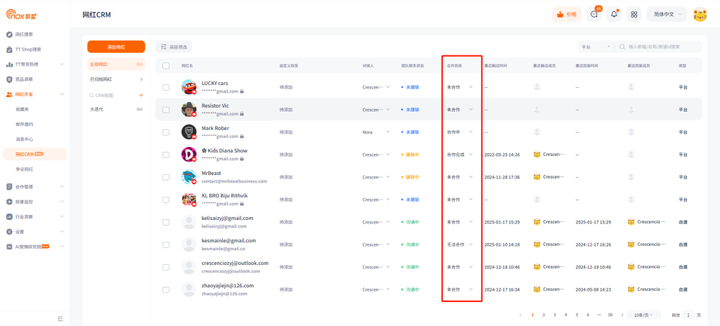 2. 团队联系状态:根据团队内所有账号与该网红通过邮件/消息进行的沟通状态聚合计算,和消息中心左侧沟通状态筛选项一致