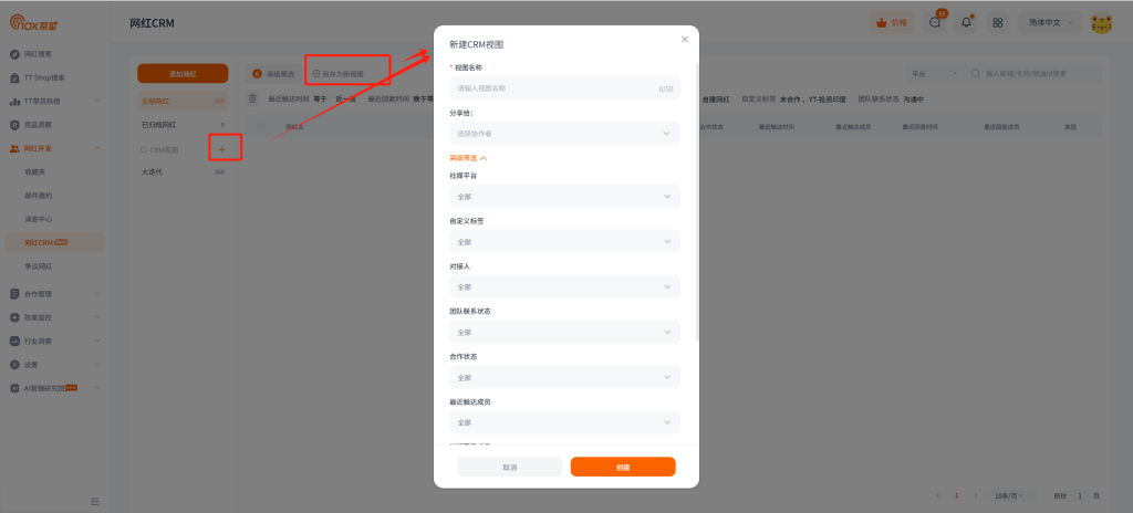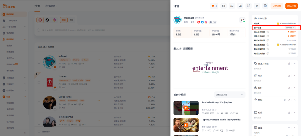 原“关系管理”的网红信息,会同步在CRM中进行展示。CRM中网红信息,由团队所有账号统一维护更新。