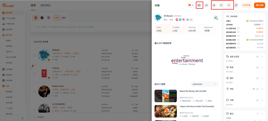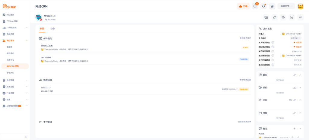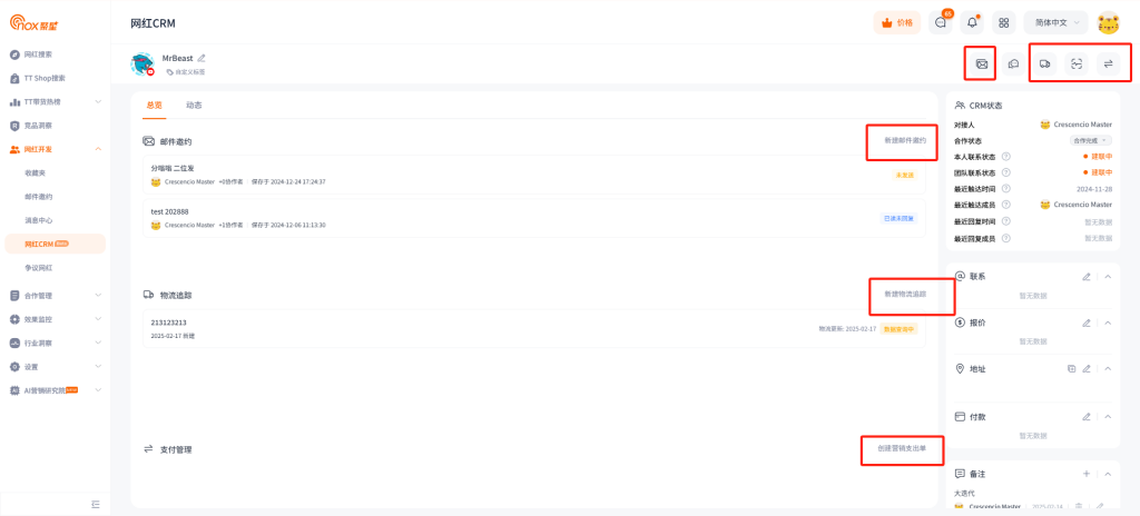 基于CRM,支持对每个网红进行不同功能的快捷操作和快捷入口。在CRM抽屉和 CRM详情都支持以下操作:创建新的邮件项目、创建新的物流追踪、创建新的营销支付单、创建新的视频监控(包括自动追踪和监控内容)