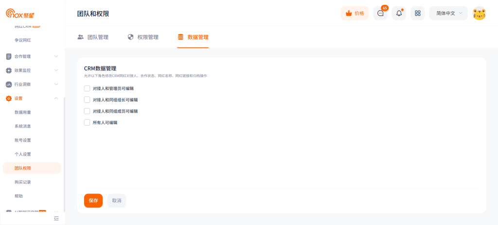 CRM网红数据中,网红名称、网红链接、合作状态、对接人的修改和网红归档的操作,默认只有对接人本人可以进行编辑修改,需要团队“管理员”在“设置-团队权限-数据管理”中,设置对接人之外的角色的权限,其他成员才能进行以上操作。
